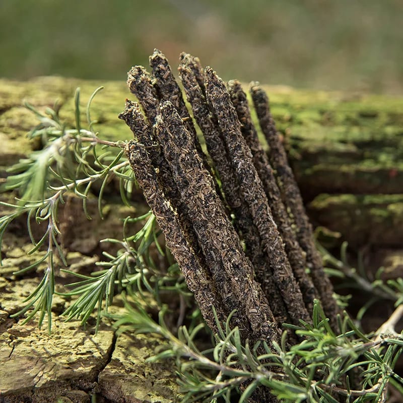 Composizione: Rosmarino, ruta, incenso, carbone vegetale, biomassa di frutta, legante naturale e sale.